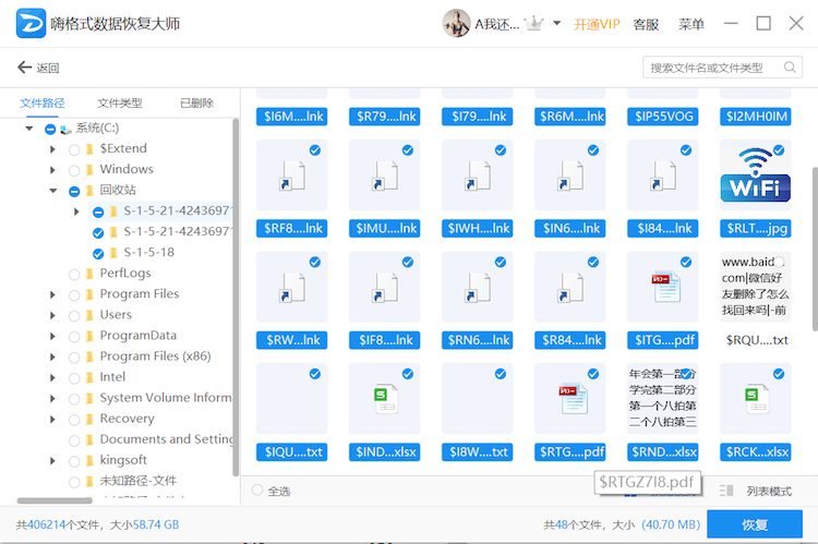 扫描结束,右侧窗口就会显示出软件扫描到的文件,此时可以按照文件路径或者文件类型两种模式选择需要恢复的文件,双击进行预览,点击【恢复】,即可找回丢失文件。