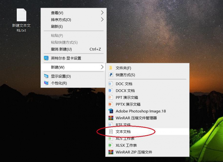 打开电脑,鼠标右击桌面,弹出菜单,选择新建文本文档,