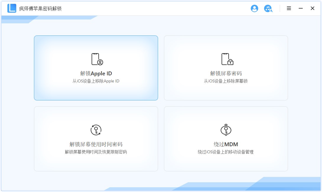 下载安装疯师傅苹果密码解锁软件,启动软件,进入界面,点击【解锁Apple ID】模式,从iOS设备上移除Apple ID,