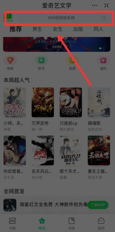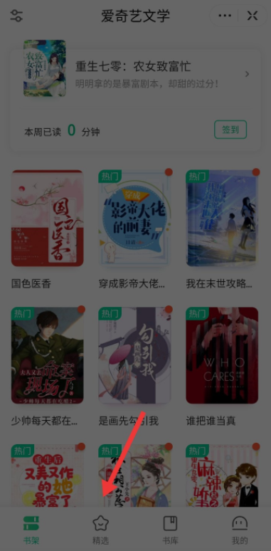 点击之后,进入爱奇艺文学界面,这里有各种小说,点击底部的【精选】,