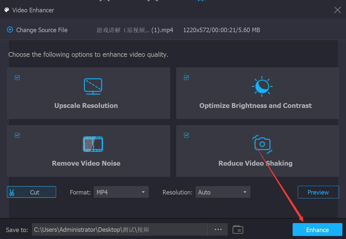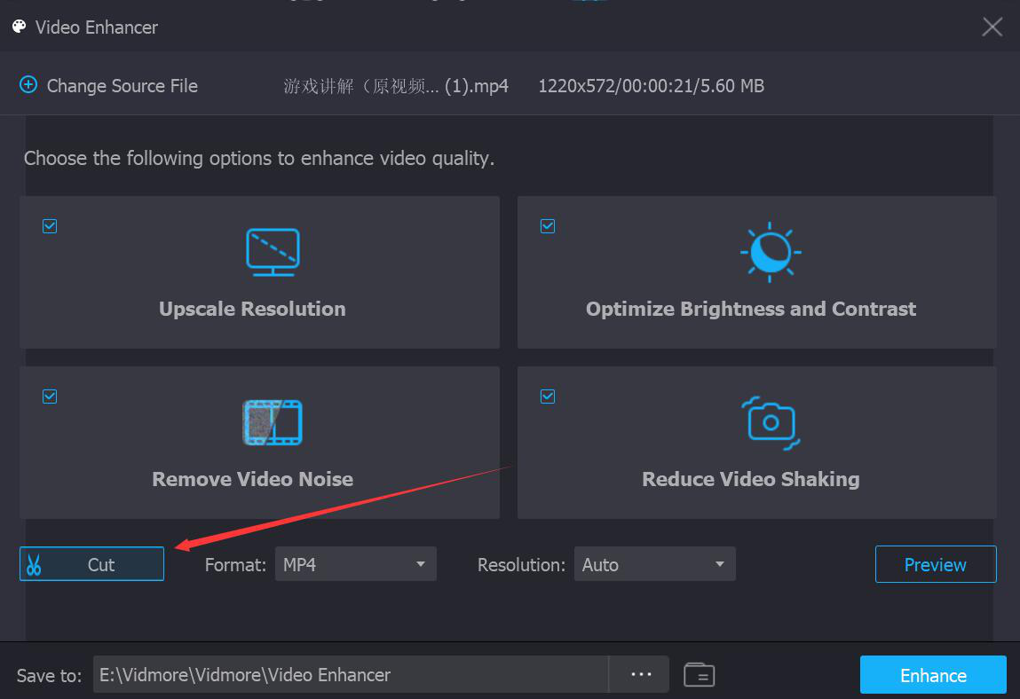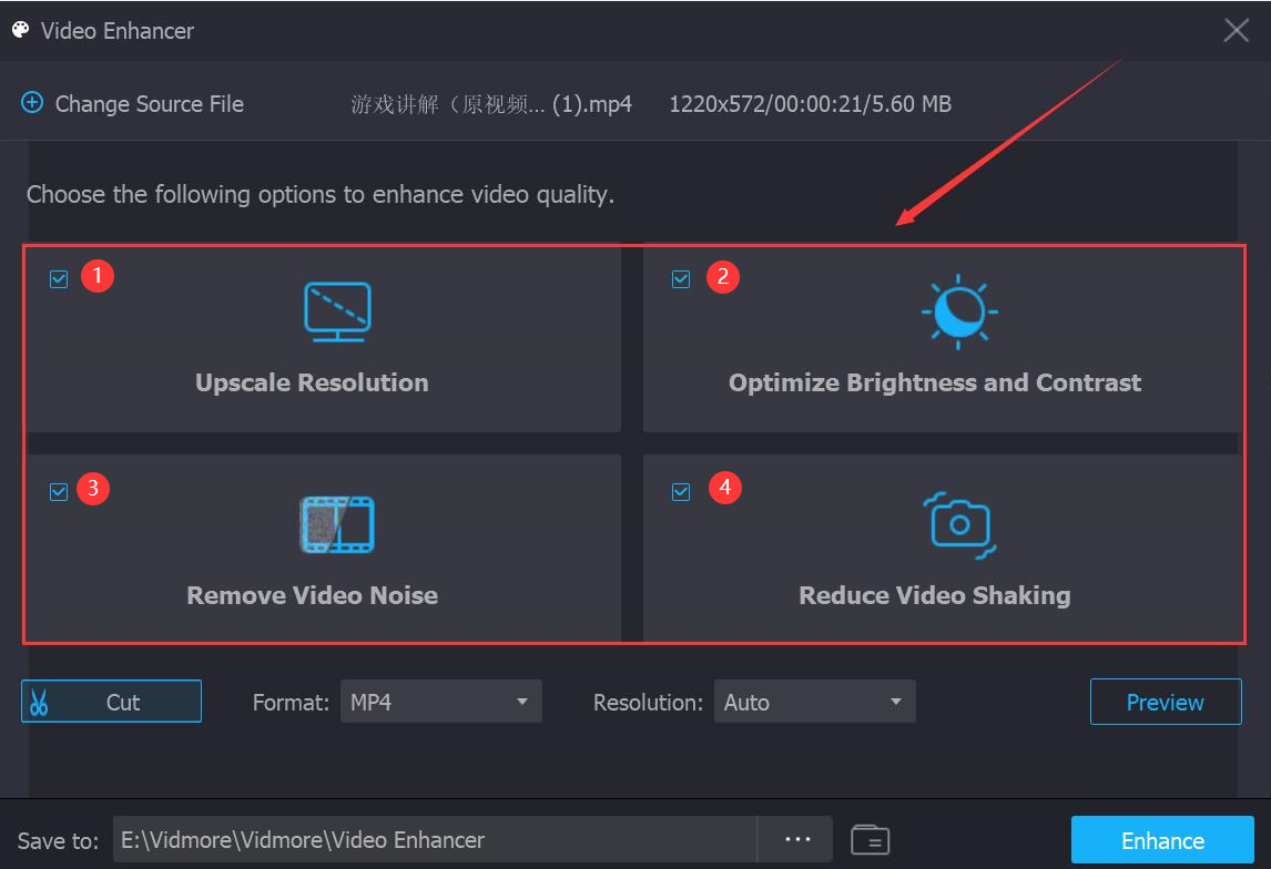 4、接下来,回到Vidmore的Video Enhancer操作界面,为了提升视频的质量,我们一般会将四个增强选项都勾选。当然了,你也可以根据自己需要来选择。第一个是提高分辨率,第二个是优化亮度和对比度,第三个是去除视频噪音,第四个是减少视频抖动。