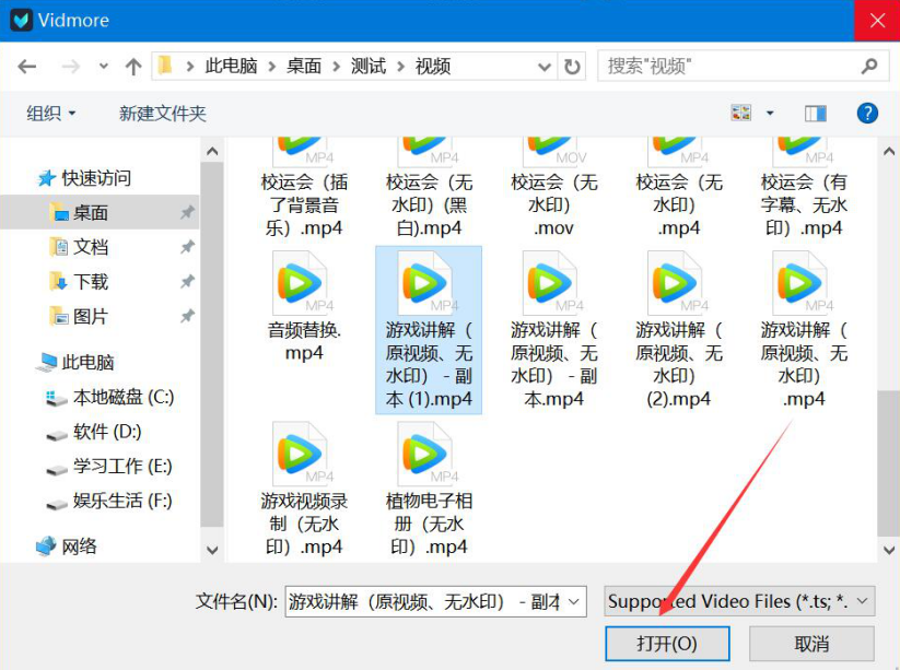 3、然后,在弹出的窗口中,将需要提升质量的视频文件选中,并点击“打开”按钮,将其导入Vidmore。