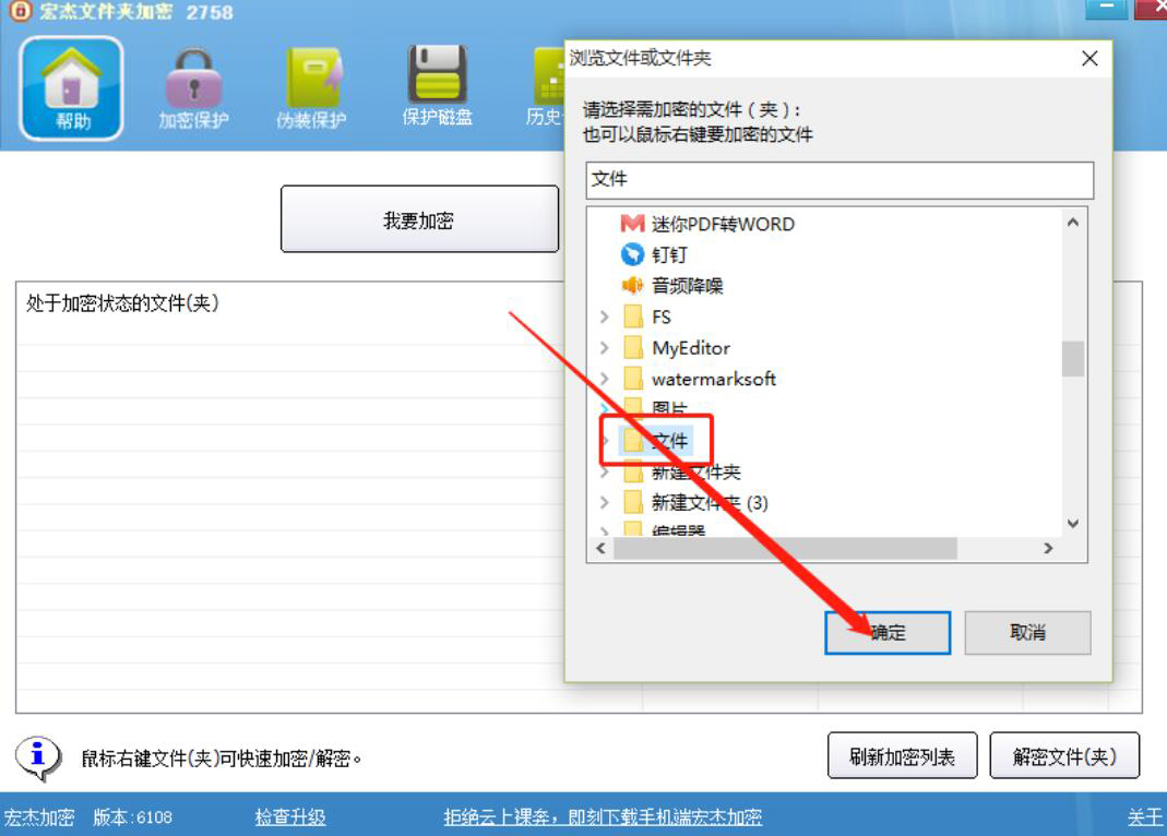 3、此时,宏杰文件夹加密软件便会弹出如下图窗口,我们选择自己要加密的电脑文件,并点击“确定”按钮。
