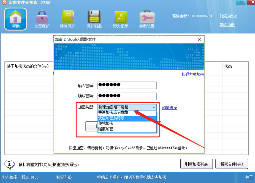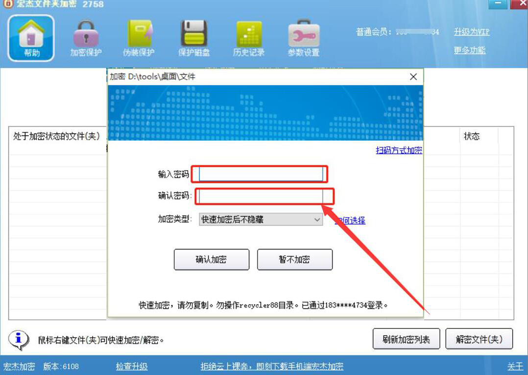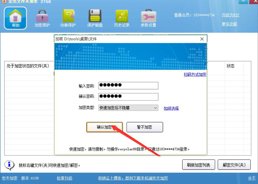 6、加密的密码和类型都设置好了,我们点击“确定加密”按钮,宏杰文件夹加密软件便开始加密电脑文件。