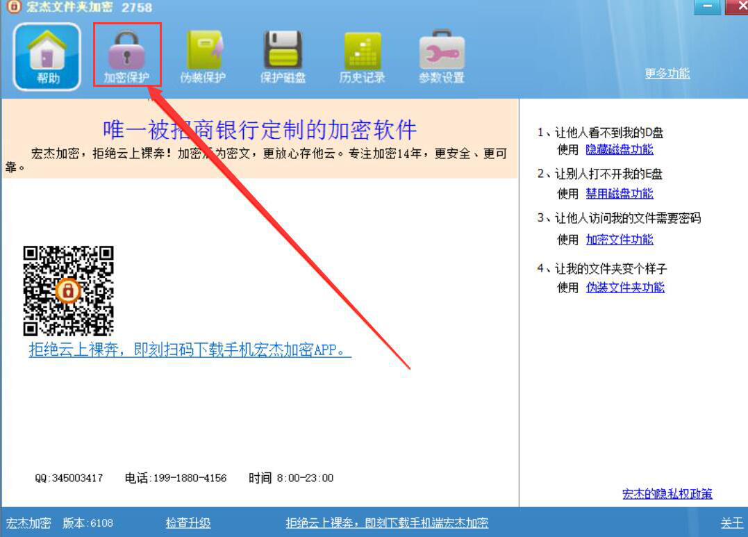 1、首先,我们打开宏杰文件夹加密软件,点击菜单栏中的“加密保护”,从而切换至它的操作界面。