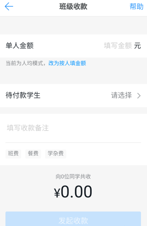 打开班级收款功能,如图,点击设置收款金额,默认是人均模式,适用于收取班费、餐费,