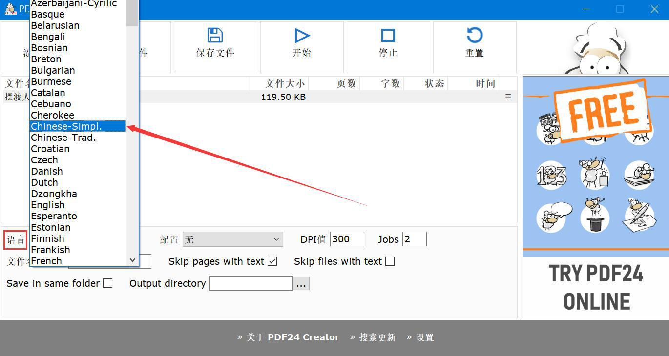 4、接下来,我们根据图片中文本的语言,在PDF24 Creator界面下方的语言列表中选择对应的文本语言。例如,我们导入的图片的文字是简体中文,就从语言列表中点选“Chinese-Simpl.”。