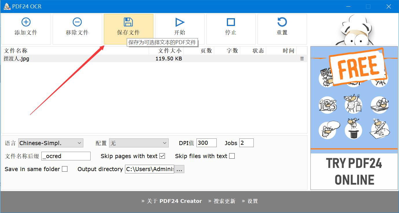 8、最后,文本识别完成,我们点击界面中的“保存文件”按钮,PDF24 Creator便会将识别了的文本保存为PDF文件,并将它放在刚才所设置的路径中。