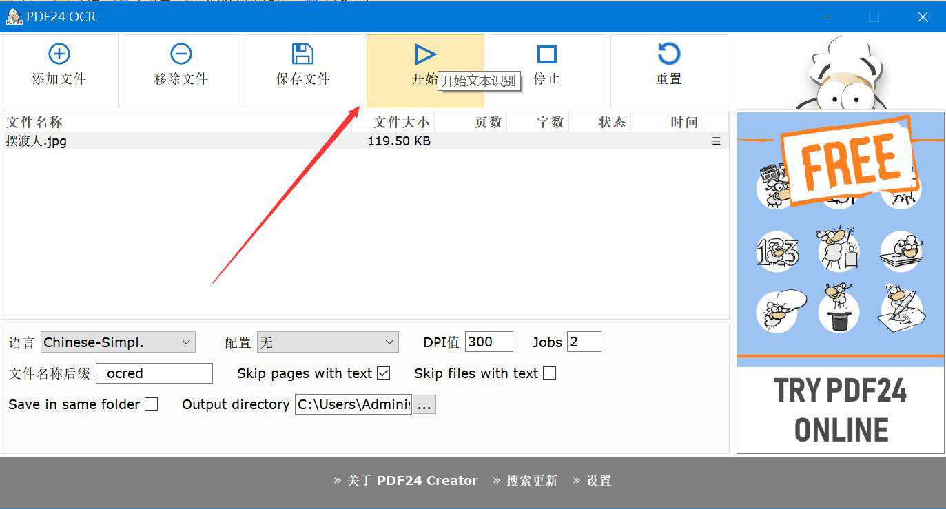 7、语言和路径都设置好了,我们就点击界面功能栏中的“开始”按钮,PDF24 Creator便开始识别文本。