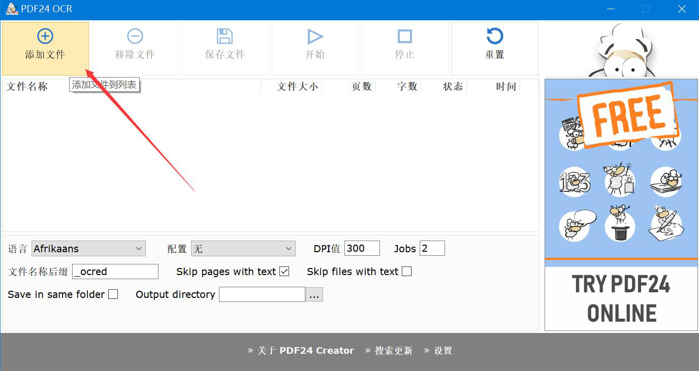 2、进入PDF24 Creator的识别文本界面,点击左上方的“添加文件”按钮。