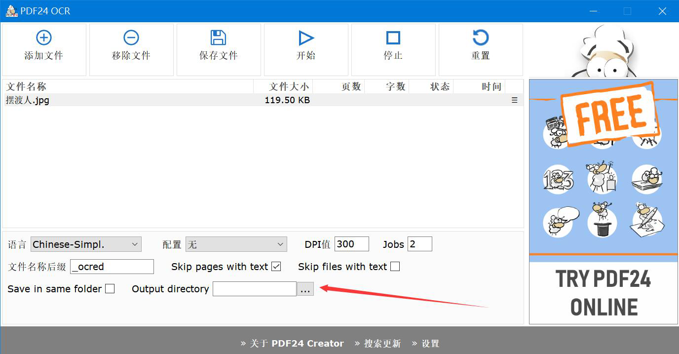 5、PDF24 Creator识别文本的语言设置好了后,我们还要点击界面中的“…”按钮来设置路径。