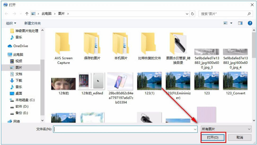 2、在弹出的窗口中,选择需要转BMP的JPG图片,并点击“打开”按钮,将其一并导入图片批量处理系统。