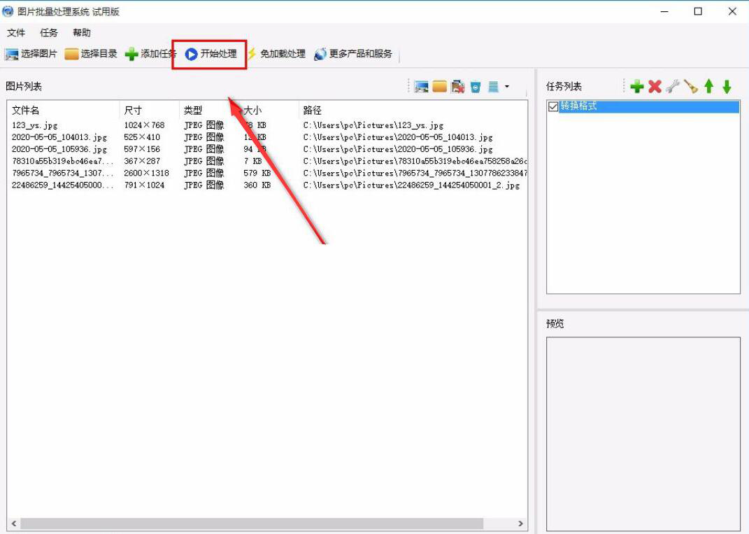 6、回到图片批量处理系统的操作界面,我们点击功能栏中的“开始处理”按钮。