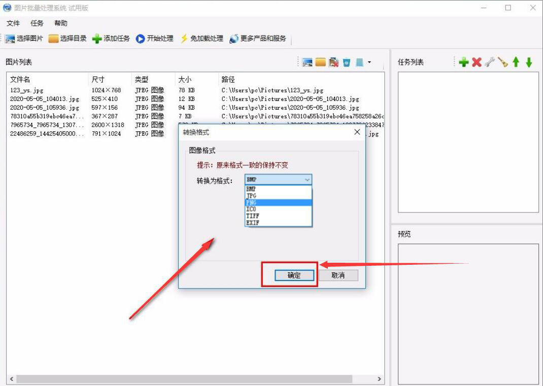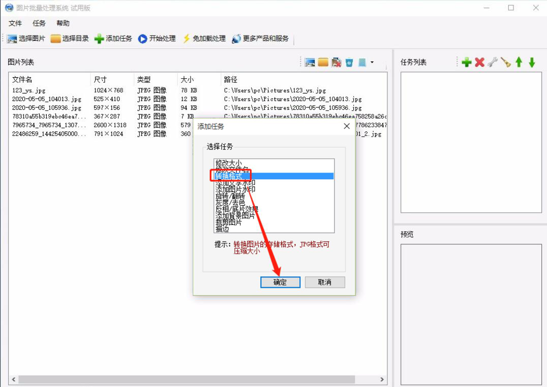 4、此时,图片批量处理系统会弹出添加任务窗口,从任务列表中点选“转换格式”,再点击“确定”按钮。