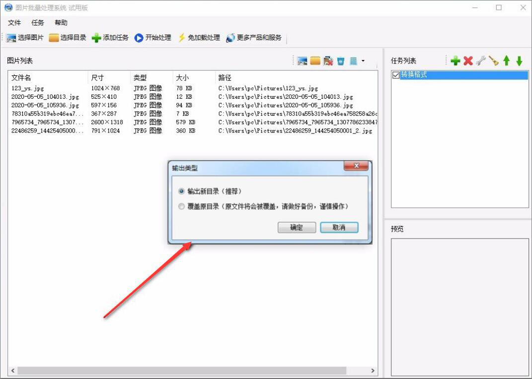 7、此时,图片批量处理系统会弹出输出类型窗口,我们根据自己的需要来选择输出目录类型,这里选择的是“输出新目录(推荐)”,再点击“确定”按钮。