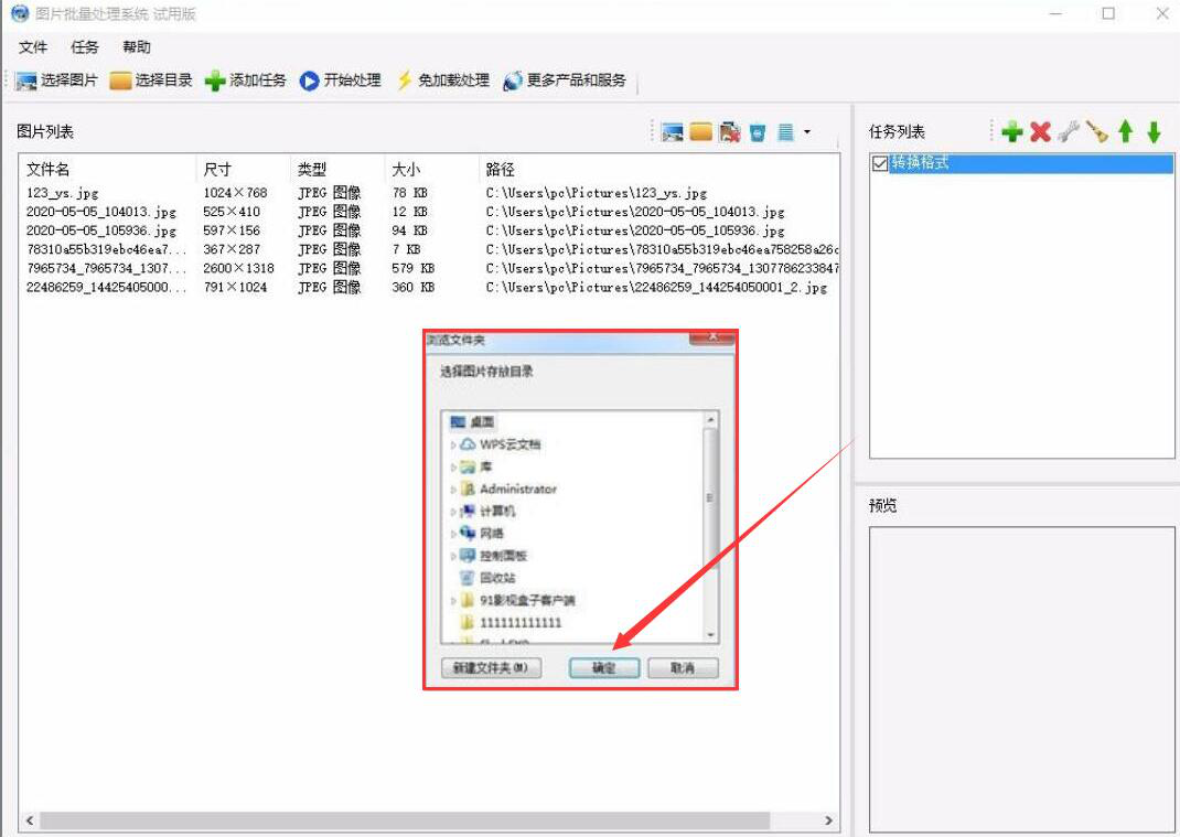 8、最后,在弹出的浏览文件夹窗口中,选择JPG批量转BMP后的文件保存路径,并点击“确定”按钮,图片批量处理系统便开始批量将JPG转BMP。