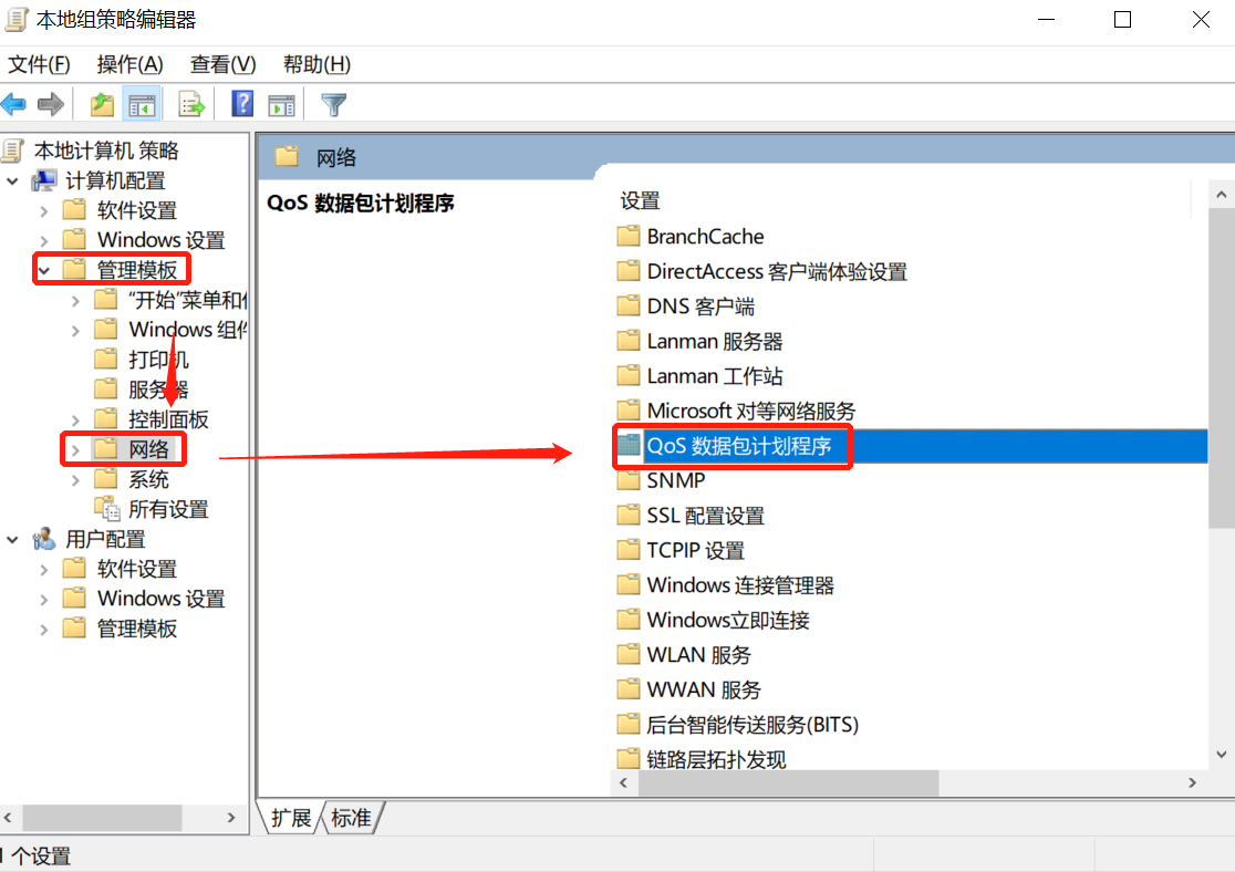 2、打开本地组策略编辑器,如图,在左侧栏依次点击【计算机配置】——【管理模板】——【网络】,在右侧窗口点击【QoS数据包计划程序】,