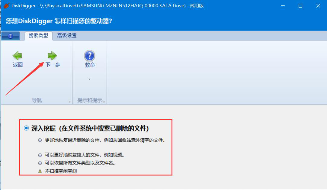 2、然后,进入DiskDigger的搜索类型界面,我们在两种类型中选择“深入挖掘(在文件系统中搜索已删除的文件),并点击“下一步”按钮,DiskDigger便开始搜索已删除的文件。