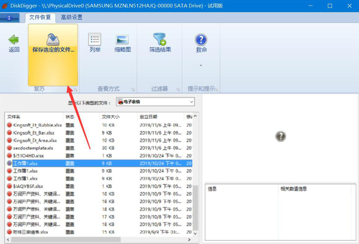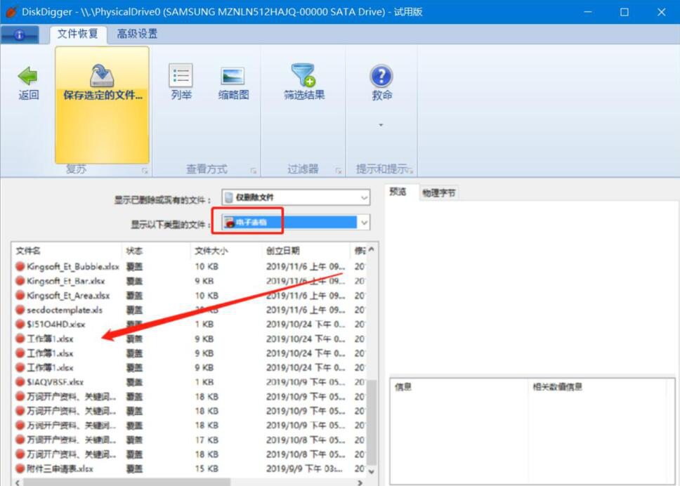 4、接下来,DiskDigger便会将最近删除的电子表格显示出来,如下图。