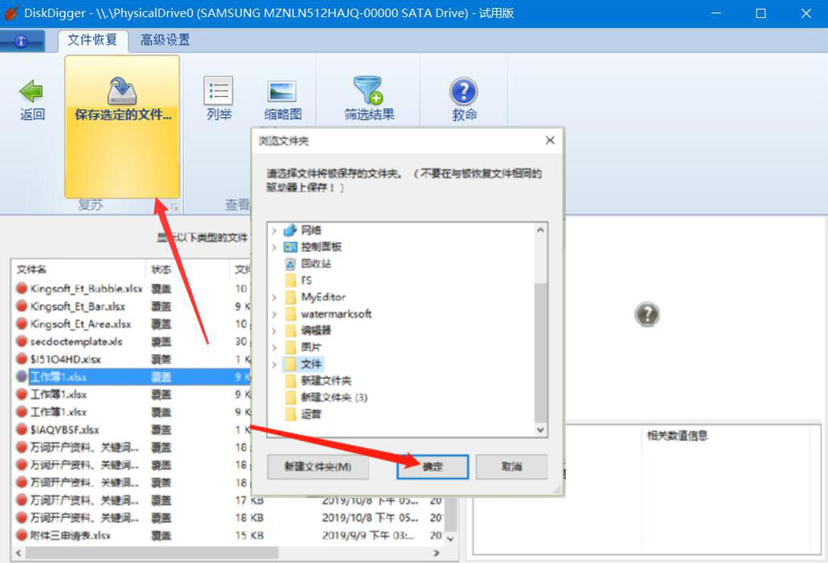 6、最后,在弹出的窗口中,选择恢复的删除文件所要存放的路径,再点击“确定”按钮,DiskDigger便会恢复所选的已删除文件。