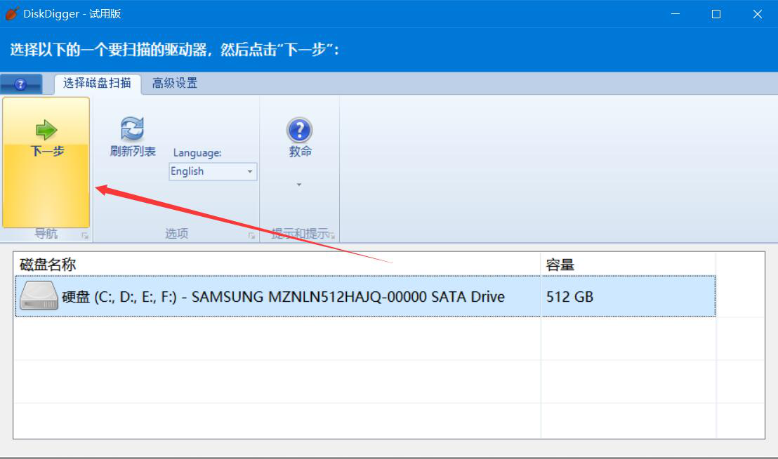 1、首先,我们打开DiskDigger软件,切换至“选择磁盘扫描”选项界面,单击选中要恢复删除文件所在的磁盘,再点击“下一步”按钮。