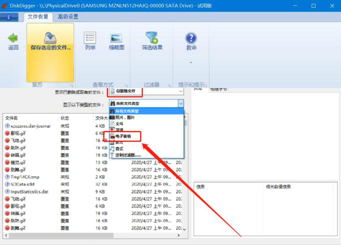 3、由于我们要用DiskDigger恢复已删除的文件,因此,这里我们将显示的文件选择为“仅删除文件”,并且根据自己想要恢复的已删除文件类型来更针对性显示,例如,我们要恢复的是某个电子表格,这里,就选择显示电子表格的类型文件。