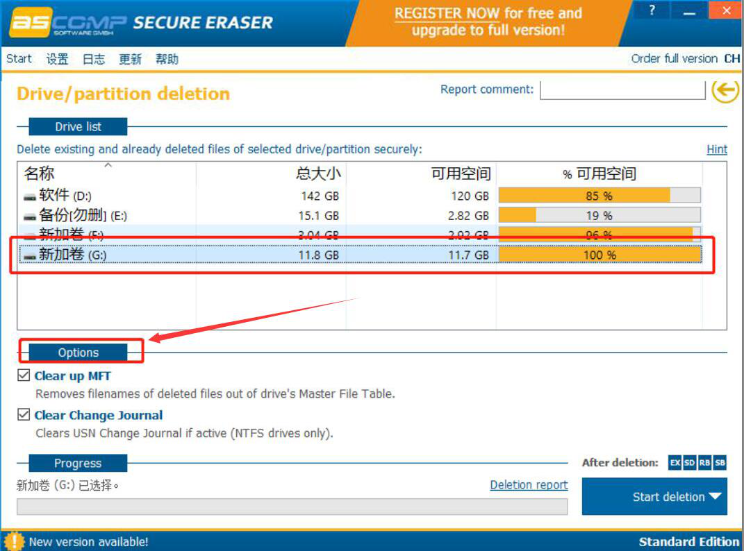 3、然后,我们将“Clear up MFT”和“Clear Change Journal”这两个选项勾选,这样一来,Secure Eraser删除磁盘分区时才会更彻底。