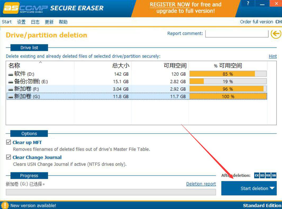 4、接下来,为了让Secure Eraser删除所选的磁盘分区,我们点击界面右下方的“Start deletion”按钮。
