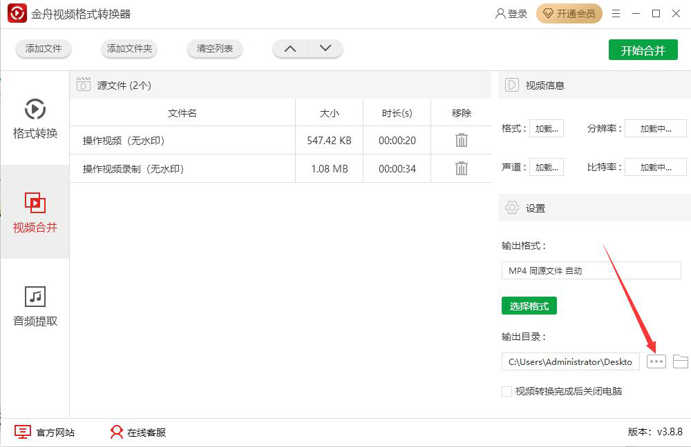 4、接下来,继续回到金舟视频格式转换器的视频合并界面,如果输出目录也要更改,就点击如下图的“…”按钮。