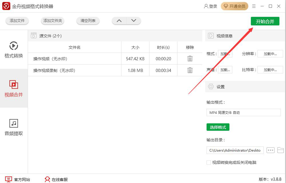 6、视频合并的格式、路径等参数都设置完成后,点击界面右上方的“开始合并”按钮,金舟视频格式转换器便开始合并导入的视频。