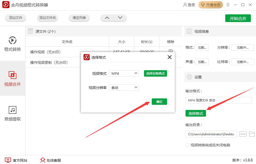 3、然后,回到金舟视频格式转换器的视频合并界面,如果输出格式需要更改,就点击“选择格式”按钮,并在它弹出的小窗口中,设置视频格式、视频分辨率,设置好了,再点击“确定”按钮。
