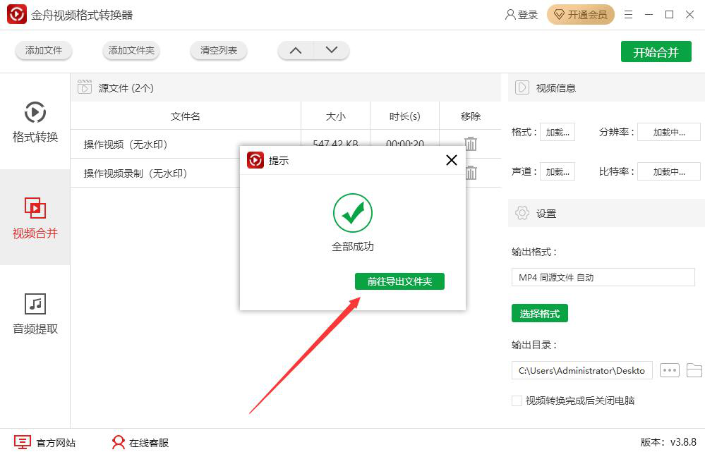 7、最后,如果弹出如下图的小窗口提示,则说明金舟视频格式转换器已经成功完成了视频合并,并将合并好的视频保存到指定的路径了。