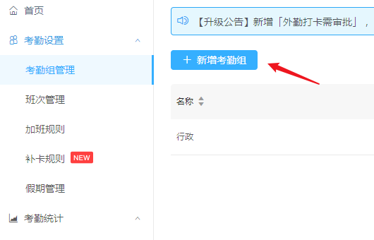进入考勤组管理窗口,如图,点击【新增考勤组】,创建一个新的不固定时间的考勤组,