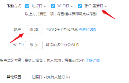 接着设置考勤方式,包括【地点打卡】、【WiFi打卡】、【蓝牙打卡】,再来设置打卡地点,