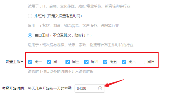 根据实际情况设置工作日,然后选择考勤开始时间,