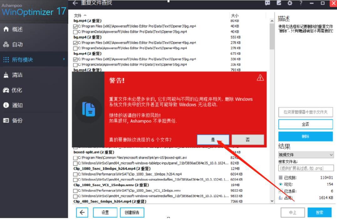 6、最后,弹出如下图的警告窗口。我们直接点击“是”按钮,Ashampoo WinOptimizer便会将所选的重复文件一并删除。