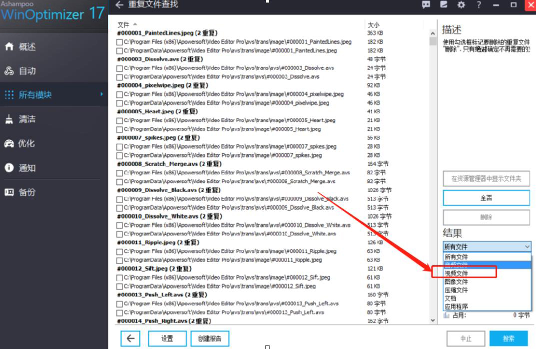 4、接下来,我们可以在界面右测选择结果展示的方式,例如,我们想要先删除重复的视频文件,就选择“视频文件”选项。此时,在Ashampoo WinOptimizer界面中部的文件列表中便会展示电脑重复的所有视频文件。