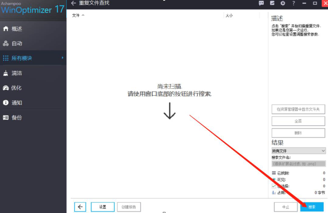 2、然后,点击界面右下方的“搜索”按钮,Ashampoo WinOptimizer便开始查找电脑的重复文件。