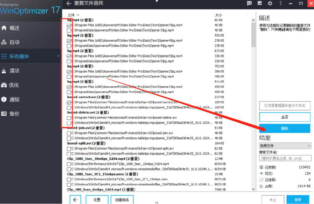 5、我们勾选自己想要Ashampoo WinOptimizer删除的重复文件,再点击界面右侧的“删除”按钮。