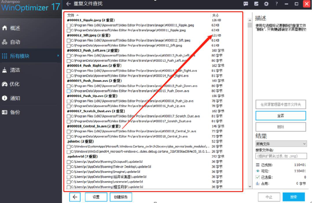 3、等待一会,我们便可以看到Ashampoo WinOptimizer将电脑中重复的文件全部都搜索出来了,如下图所示。