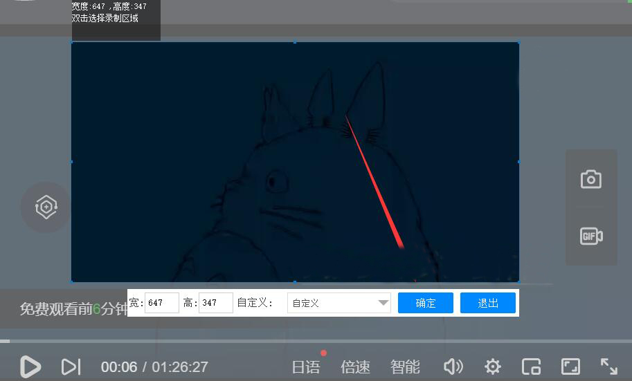 2、此时,电脑屏幕中便会出现录制视频的选区,我们既可以用家软屏幕录制软件自带的几个尺寸,也可以选择自定义,通过拉动如下图的蓝色句柄来选定视频录制的区域。