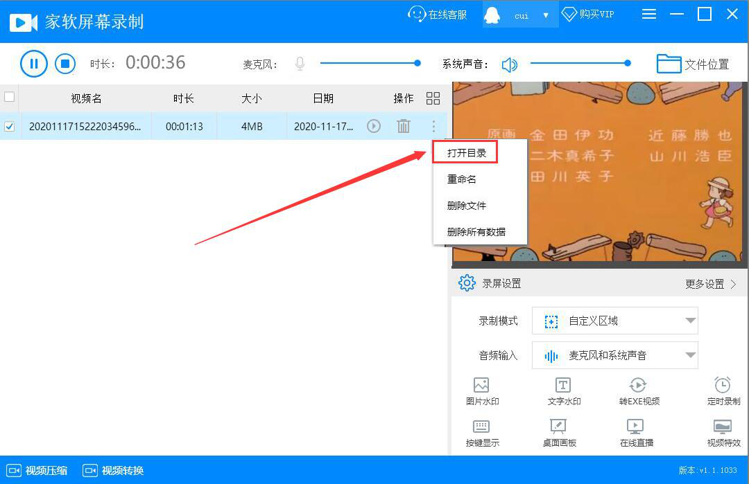 7、最后,文件列表便会出现我们刚才录制的视频,我们点击它折叠菜单中的“打开目录”选项,便可以快速打开家软屏幕录制软件录制的视频了。