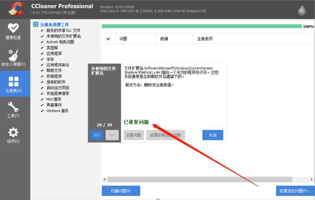 6、最后,如果弹出的窗口中显示“已修复问题”的话,那说明CCleaner成功修复了注册表。