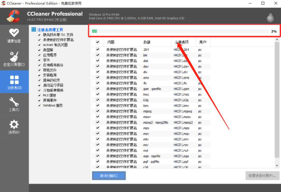 3、接下来,我们界面中便可以看到CCleaner扫描注册表存在的问题的具体进度,如下图所示。