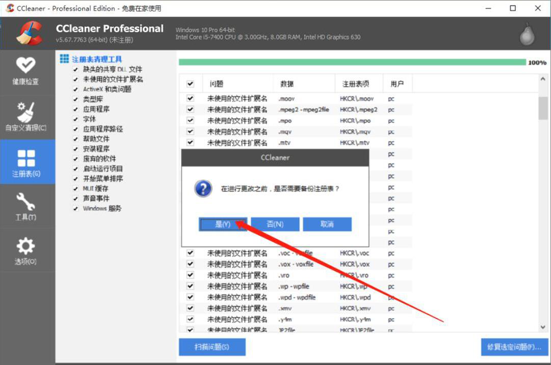 5、此时,CCleaner会弹出是否备份注册表的窗口提示,点击“是”按钮,CCleaner便开始备份注册表并修复注册表。