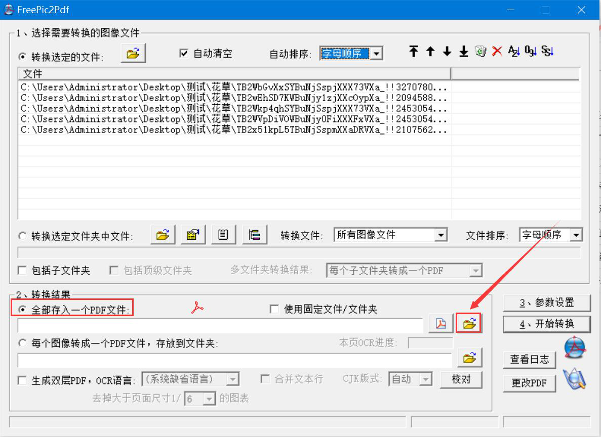 3、然后,回到FreePic2Pdf操作界面。因为要将多张图片转换成一个PDF文件,所以点选“全部存入一个PDF文件”选项,并点击如下图的文件夹按钮,继续下一步操作。