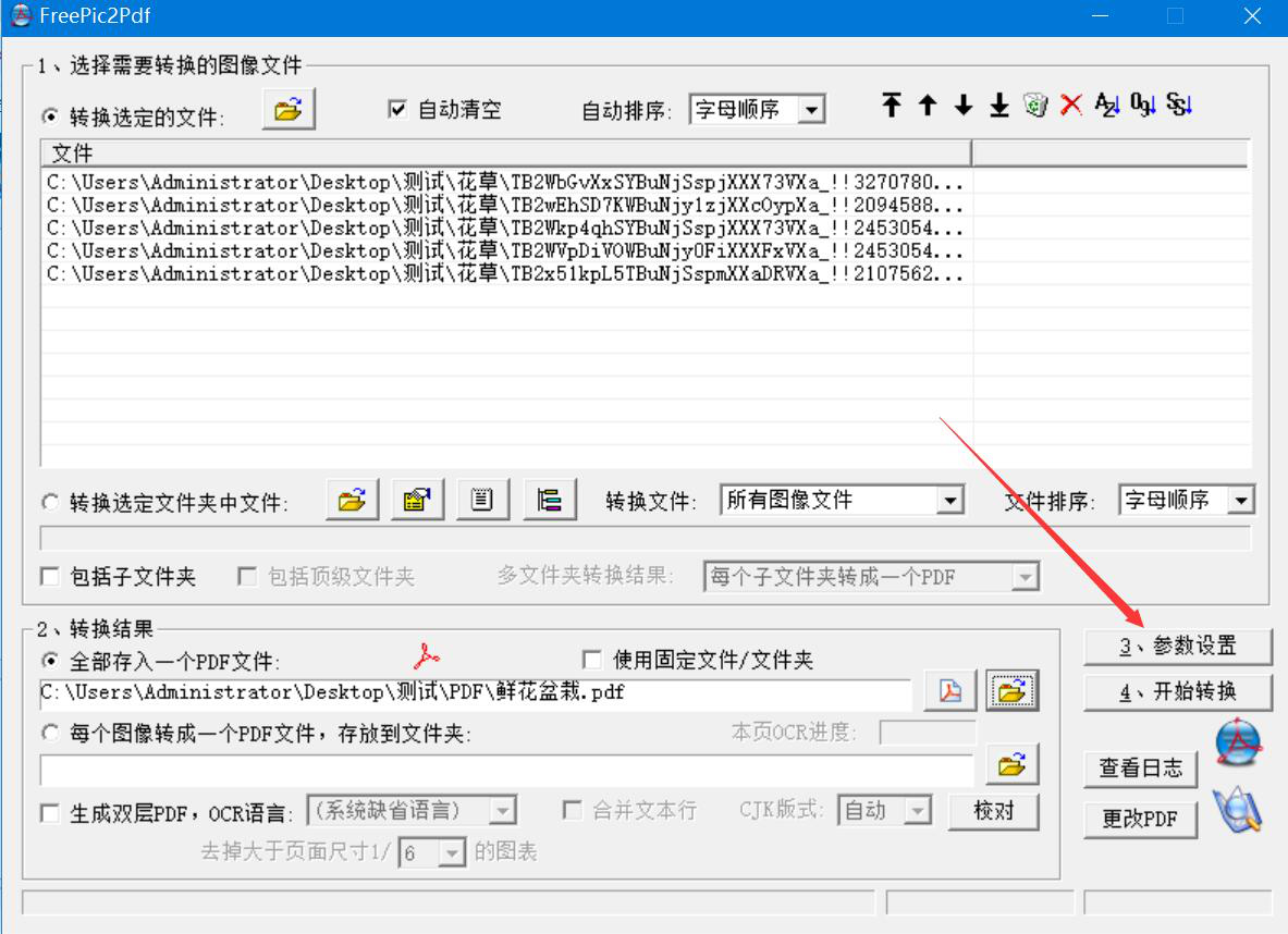 5、接下来,我们回到FreePic2Pdf操作界面,点击右侧的“参数设置”按钮。