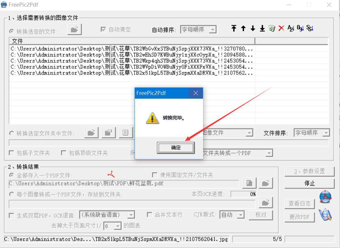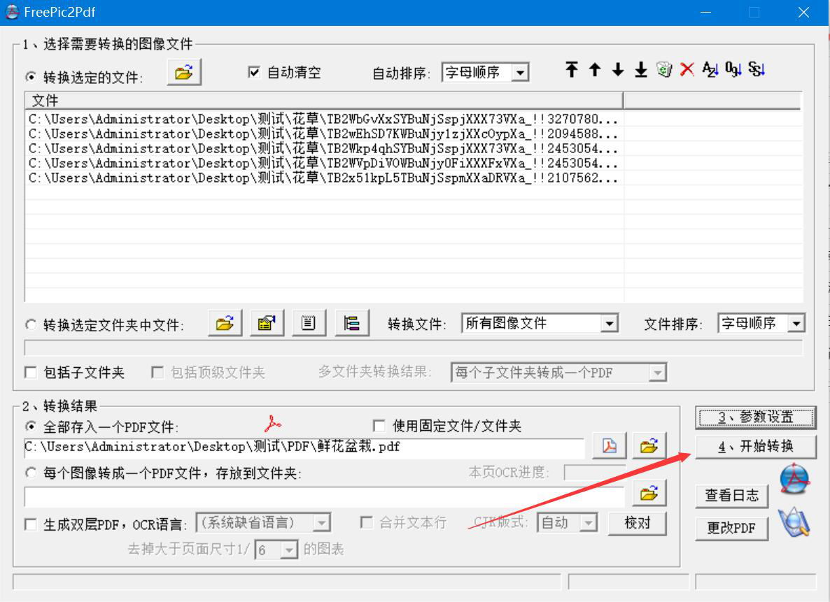 7、保存路径、参数都设置完成后,我们点击界面右下方的“开始转换”按钮,FreePic2Pdf便开始将多张图片转换成一个PDF文件。