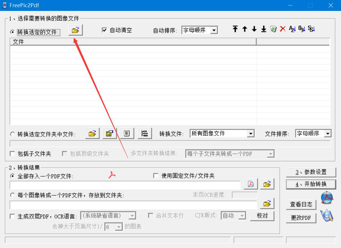 1、首先,我们打开FreePic2Pdf,在其操作界面中,点击如下图的文件夹按钮。