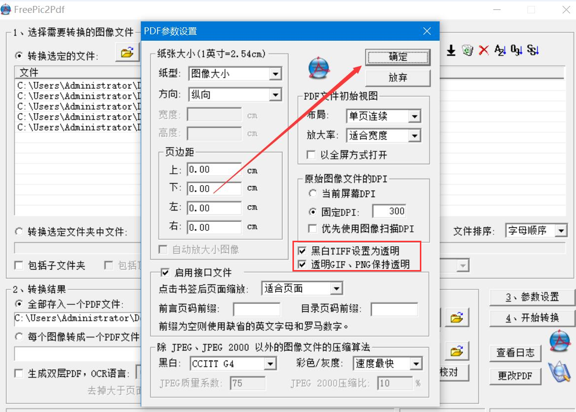 6、我们根据自己的需要设置多张图片转换成一个PDF文件的一些相关参数,设置完成,点击窗口右上方的“确定”按钮。